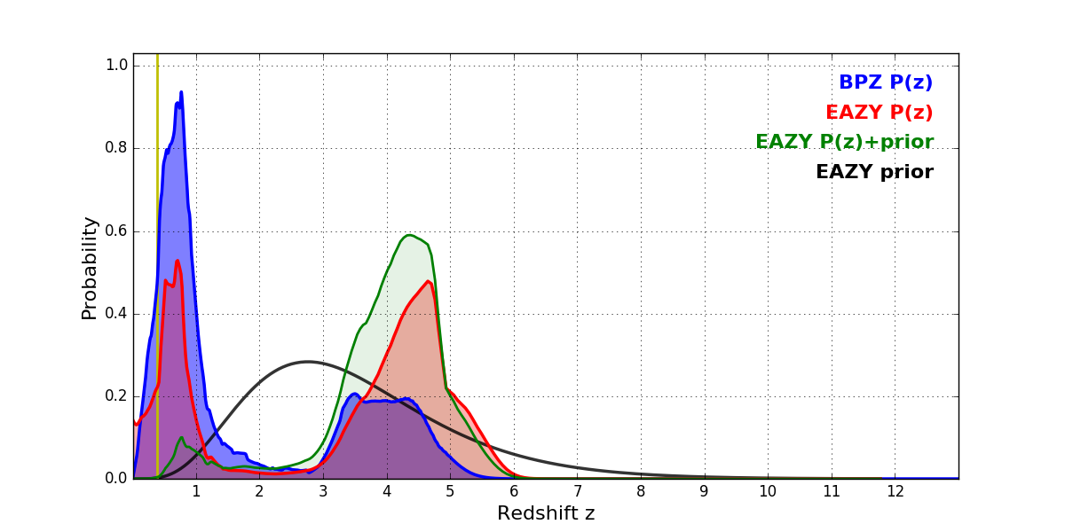 In P(z) plots: Yellow lines mark the cluster redshift z = 0.390,