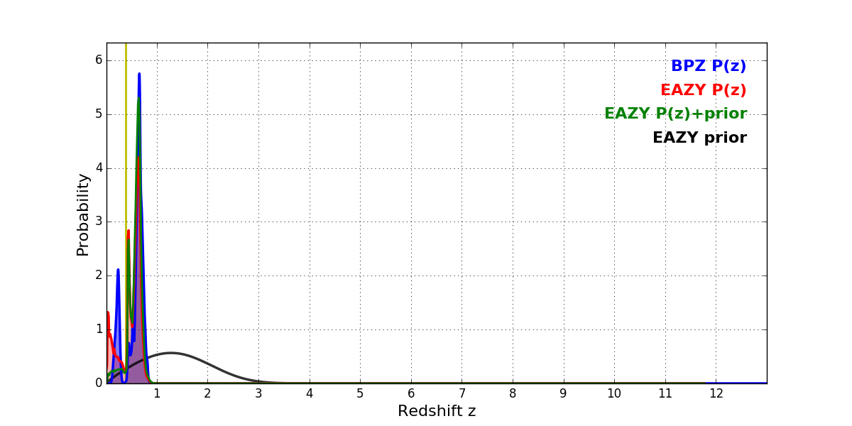 In P(z) plots: Yellow lines mark the cluster redshift z = 0.390,