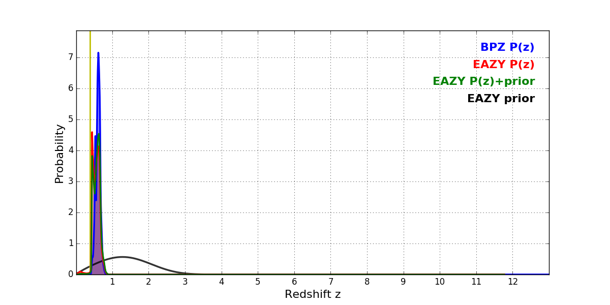 In P(z) plots: Yellow lines mark the cluster redshift z = 0.390,