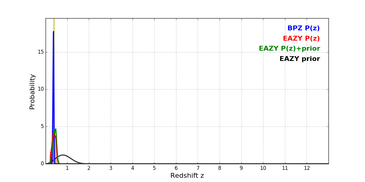 In P(z) plots: Yellow lines mark the cluster redshift z = 0.390,