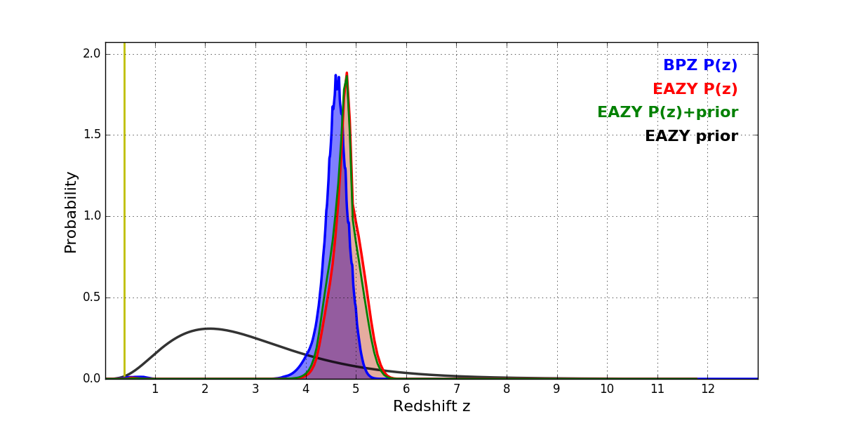 In P(z) plots: Yellow lines mark the cluster redshift z = 0.390,