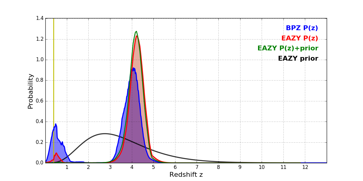 In P(z) plots: Yellow lines mark the cluster redshift z = 0.390,