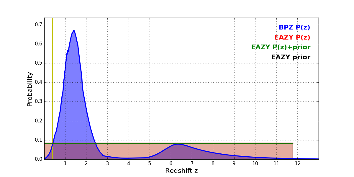In P(z) plots: Yellow lines mark the cluster redshift z = 0.390,