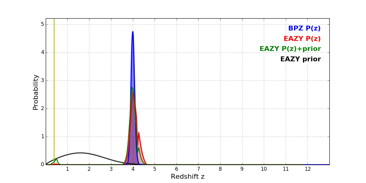 In P(z) plots: Yellow lines mark the cluster redshift z = 0.390,