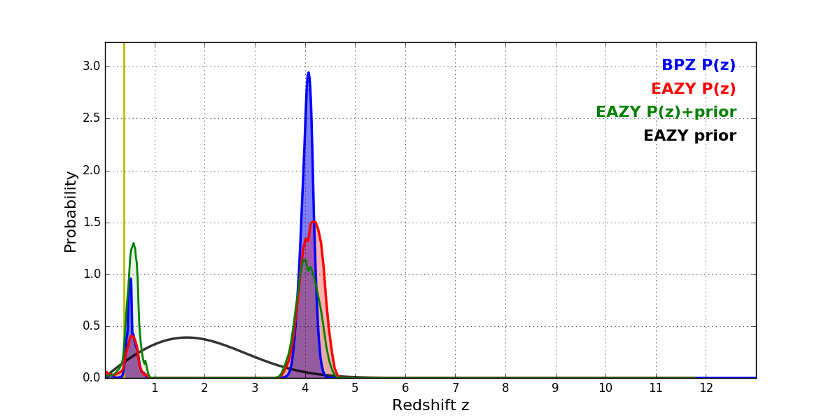 In P(z) plots: Yellow lines mark the cluster redshift z = 0.390,