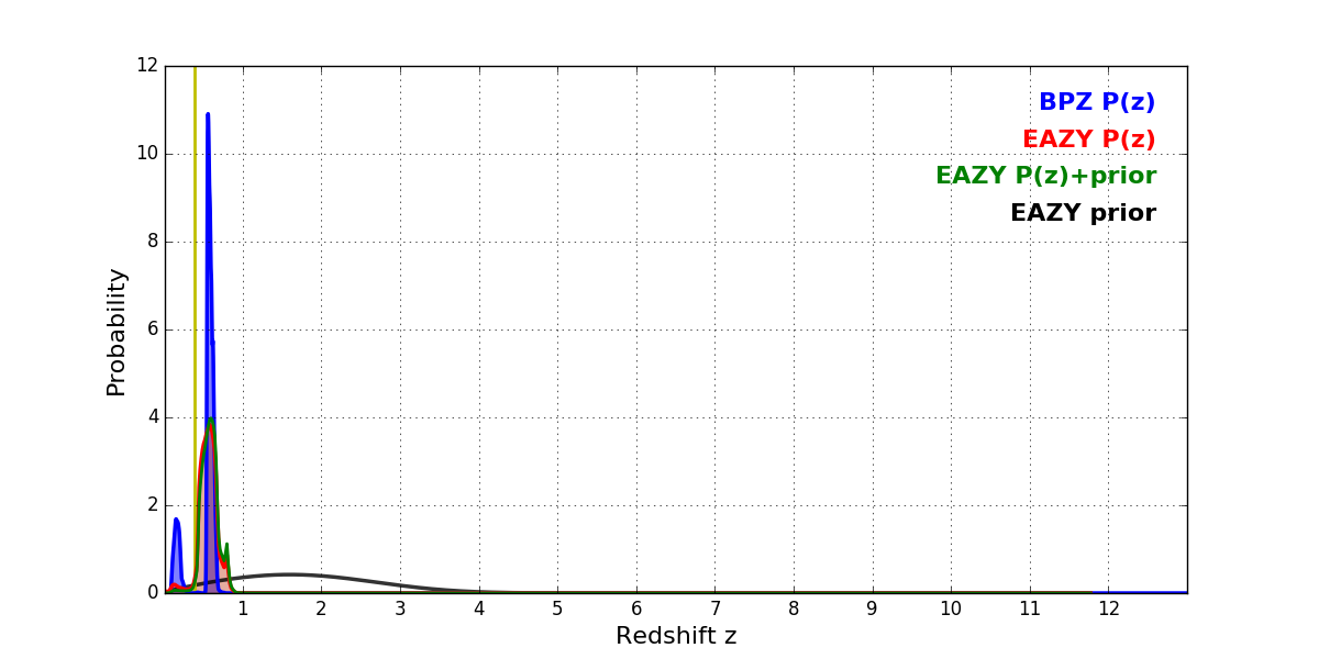 In P(z) plots: Yellow lines mark the cluster redshift z = 0.390,