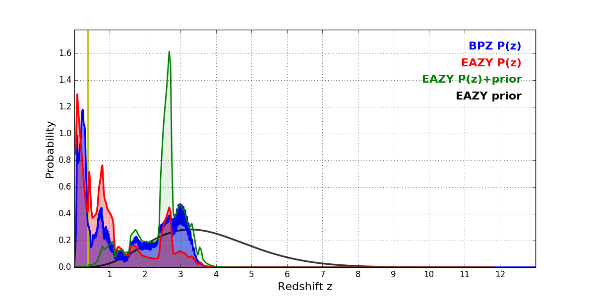 In P(z) plots: Yellow lines mark the cluster redshift z = 0.390,