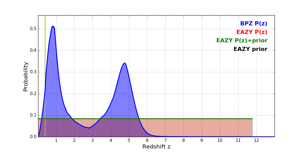 In P(z) plots: Yellow lines mark the cluster redshift z = 0.390,