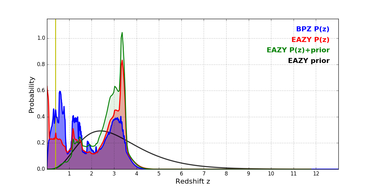 In P(z) plots: Yellow lines mark the cluster redshift z = 0.390,