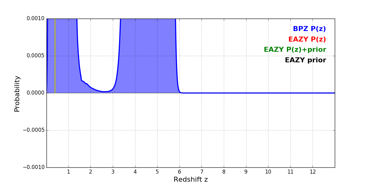 In P(z) plots: Yellow lines mark the cluster redshift z = 0.390,