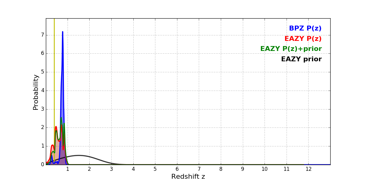 In P(z) plots: Yellow lines mark the cluster redshift z = 0.390,