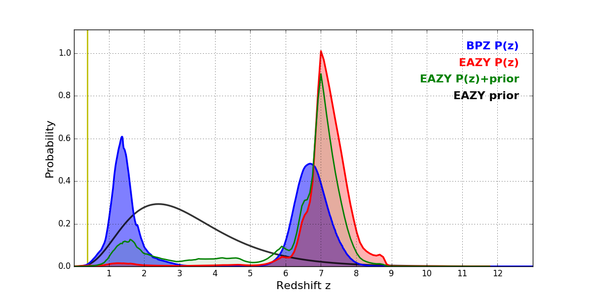In P(z) plots: Yellow lines mark the cluster redshift z = 0.390,