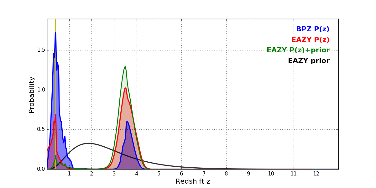 In P(z) plots: Yellow lines mark the cluster redshift z = 0.390,