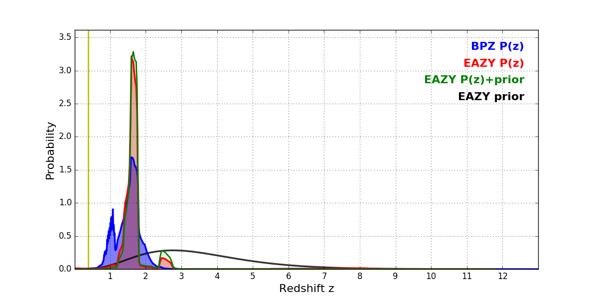 In P(z) plots: Yellow lines mark the cluster redshift z = 0.390,