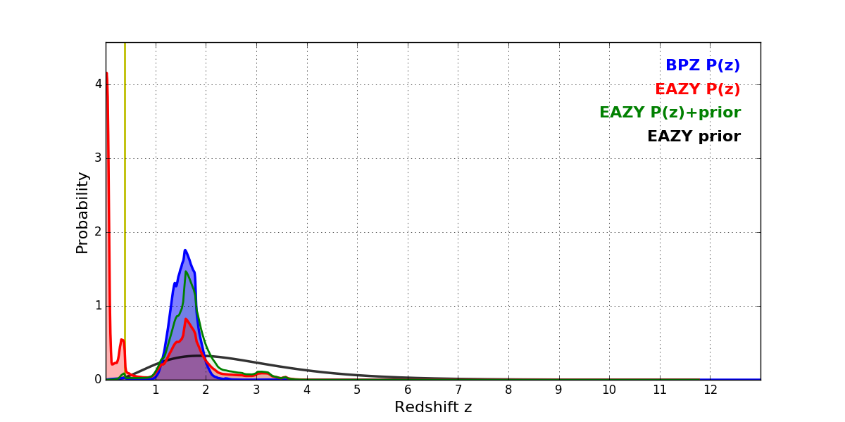 In P(z) plots: Yellow lines mark the cluster redshift z = 0.390,