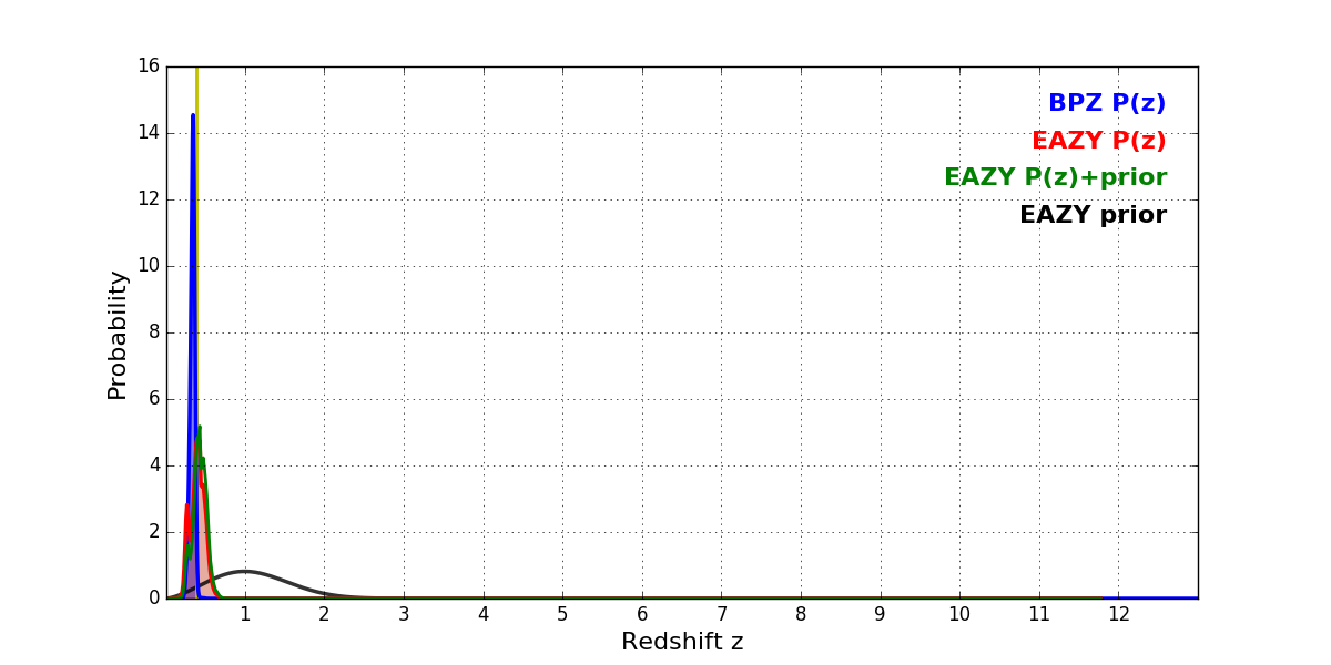 In P(z) plots: Yellow lines mark the cluster redshift z = 0.390,