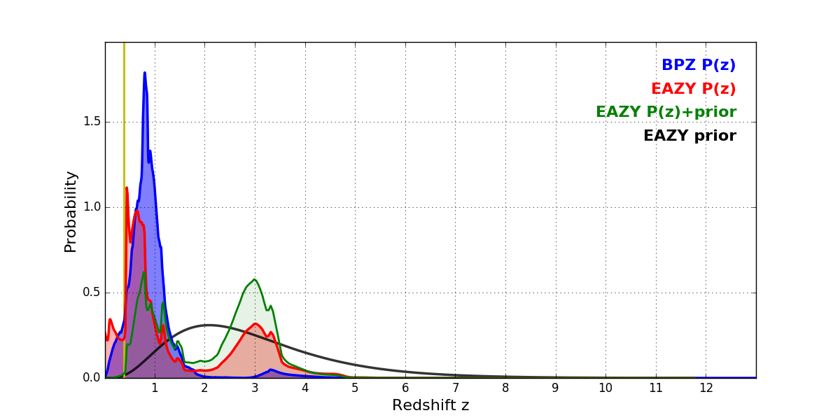 In P(z) plots: Yellow lines mark the cluster redshift z = 0.390,