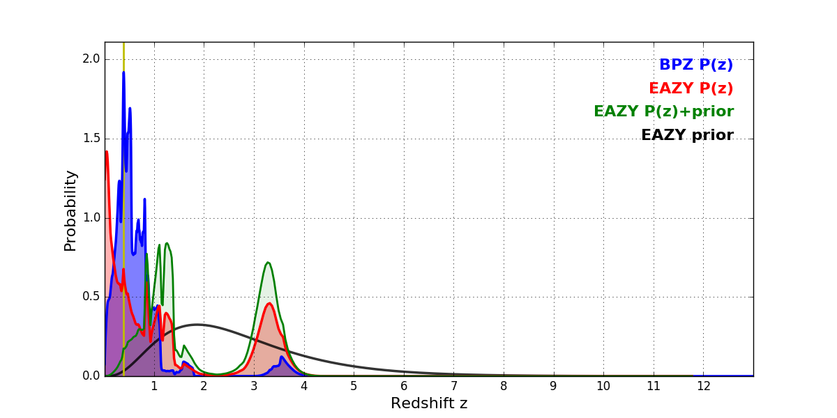 In P(z) plots: Yellow lines mark the cluster redshift z = 0.390,