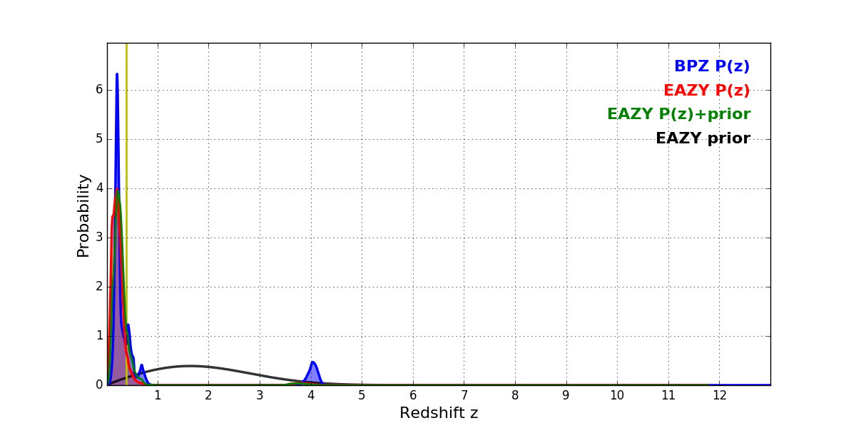 In P(z) plots: Yellow lines mark the cluster redshift z = 0.390,