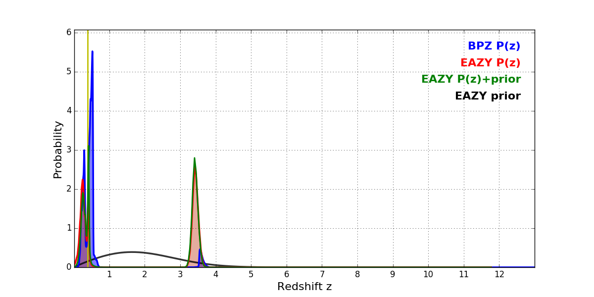 In P(z) plots: Yellow lines mark the cluster redshift z = 0.390,