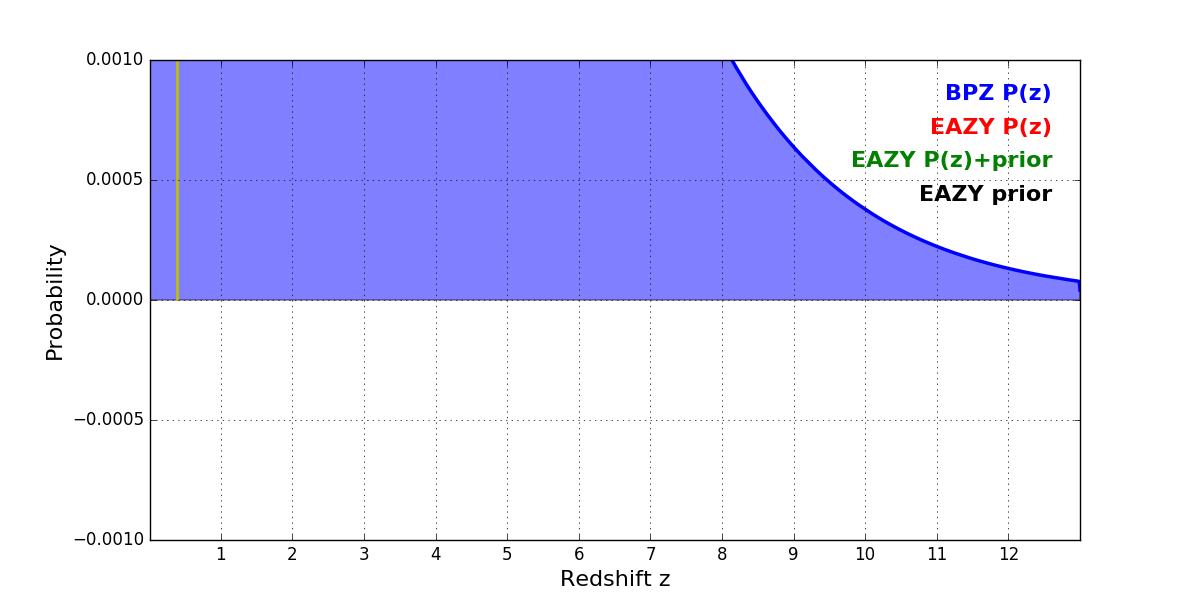 In P(z) plots: Yellow lines mark the cluster redshift z = 0.390,