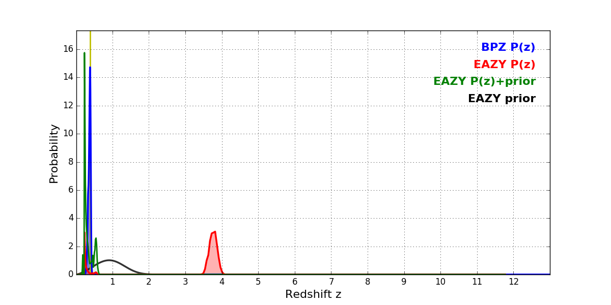 In P(z) plots: Yellow lines mark the cluster redshift z = 0.390,