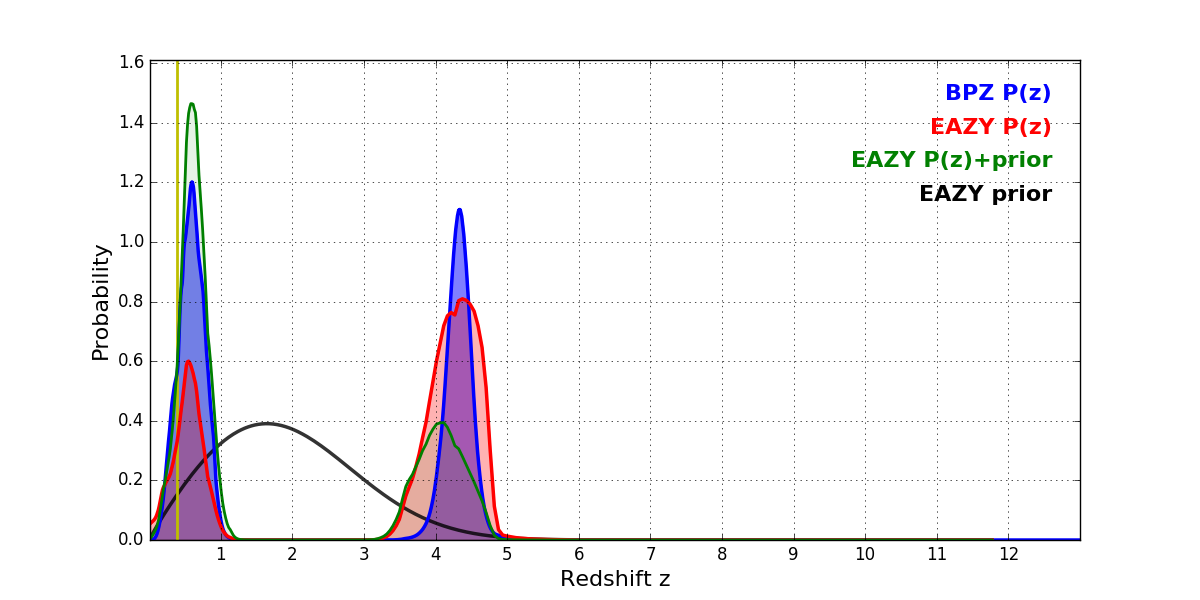 In P(z) plots: Yellow lines mark the cluster redshift z = 0.390,