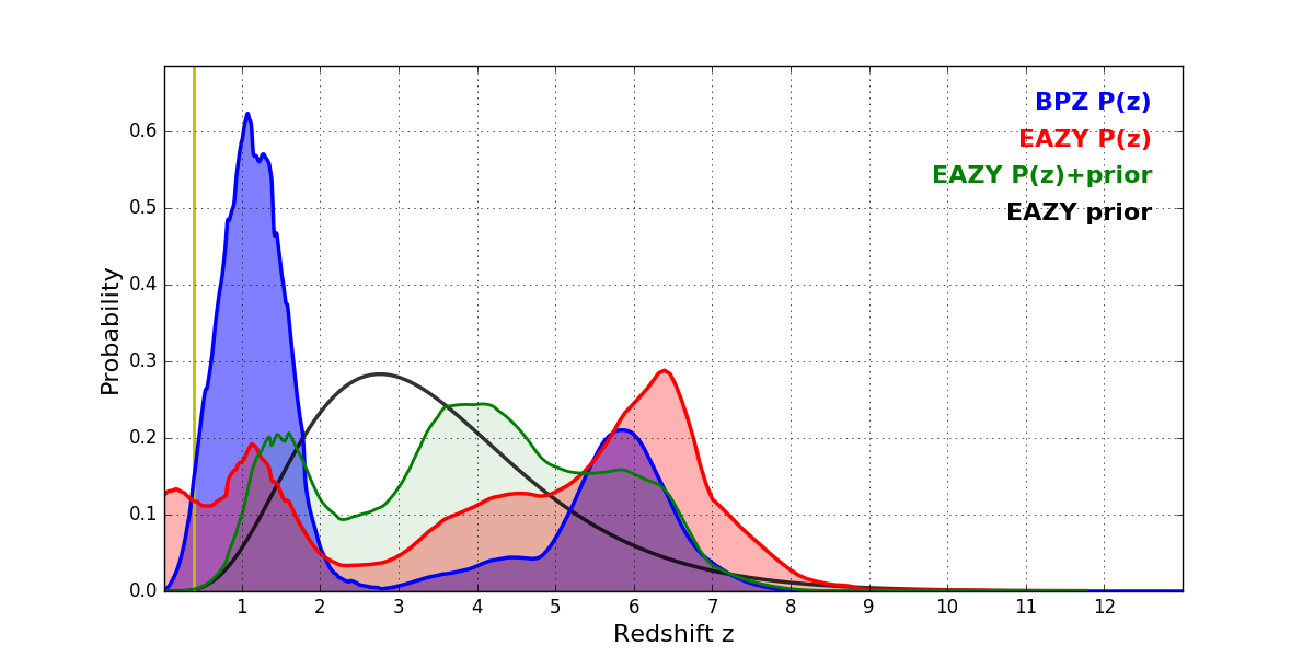 In P(z) plots: Yellow lines mark the cluster redshift z = 0.390,