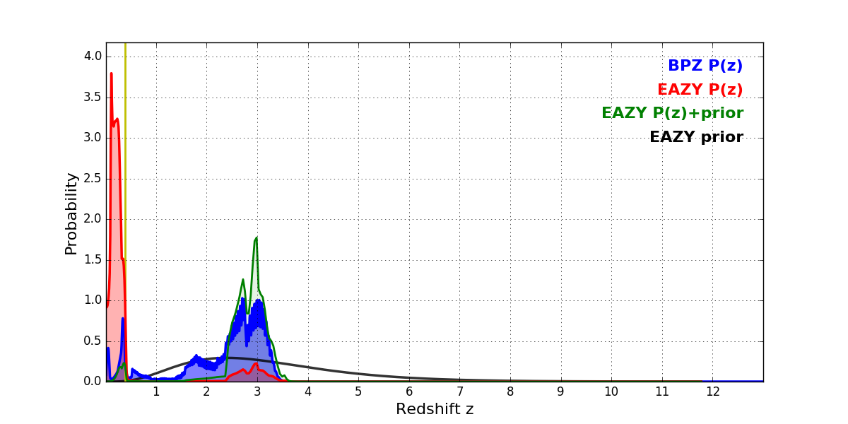 In P(z) plots: Yellow lines mark the cluster redshift z = 0.390,