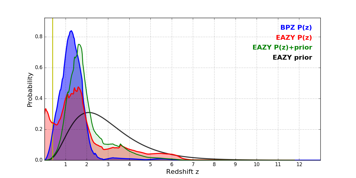 In P(z) plots: Yellow lines mark the cluster redshift z = 0.390,