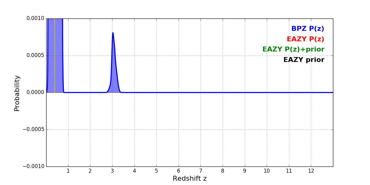 In P(z) plots: Yellow lines mark the cluster redshift z = 0.390,