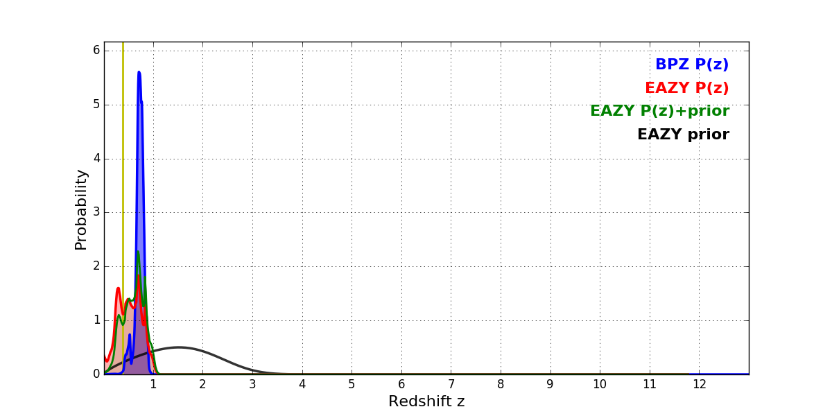 In P(z) plots: Yellow lines mark the cluster redshift z = 0.390,
