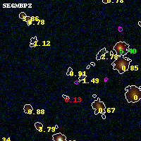 Object #2147 x,y = (1834, 3202) RA, Dec = (15:19:06.456, -81:29:52.80) = (229.77690, -81.49800) BPZ = 0.906 [0.141--1.090] type = 10.80 (SB11_A_0_l - SB3_B10) chisq2 = 0.21 ODDS = 0.26 z_cluster = 0.480