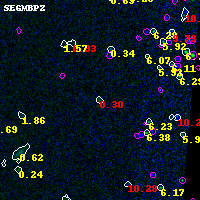 Object #2736 x,y = (4238, 2836) RA, Dec = (15:18:01.392, -81:30:14.76) = (229.50580, -81.50410) BPZ = 0.303 [0.110--4.035] type = 7.90 (SB1_B10 - Scd_B10) chisq2 = 1.22 ODDS = 0.09 z_cluster = 0.480