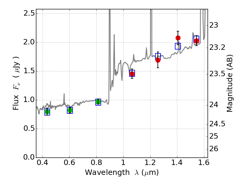 Object #4027 x,y = (1447, 2211) RA, Dec = (15:19:16.968, -81:30:52.20) = (229.82070, -81.51450) BPZ = 1.412 [1.314--1.812] type = 9.50 (SB3_B10 - SB2_B10) chisq2 = 0.12 ODDS = 0.54 z_cluster = 0.480
