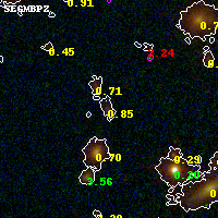 Object #4090 x,y = (2168, 2314) RA, Dec = (15:18:57.432, -81:30:46.08) = (229.73930, -81.51280) BPZ = 0.848 [0.620--0.941] type = 9.00 (SB2_B10) chisq2 = 0.91 ODDS = 0.68 z_cluster = 0.480