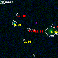 Object #4772 x,y = (1528, 1789) RA, Dec = (15:19:14.832, -81:31:17.40) = (229.81180, -81.52150) BPZ = 0.917 [0.571--10.283] type = 9.20 (SB2_B10 - SB3_B10) chisq2 = 4.41 ODDS = 0.21 z_cluster = 0.480