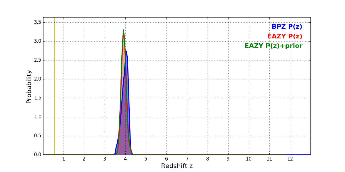 In P(z) plots: Yellow lines mark the cluster redshift z = 0.546,