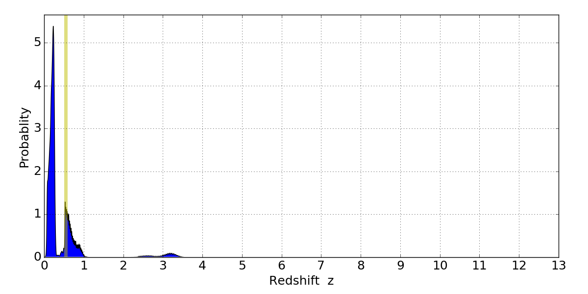 In P(z) plots: Yellow lines mark the cluster redshift z = 0.546,