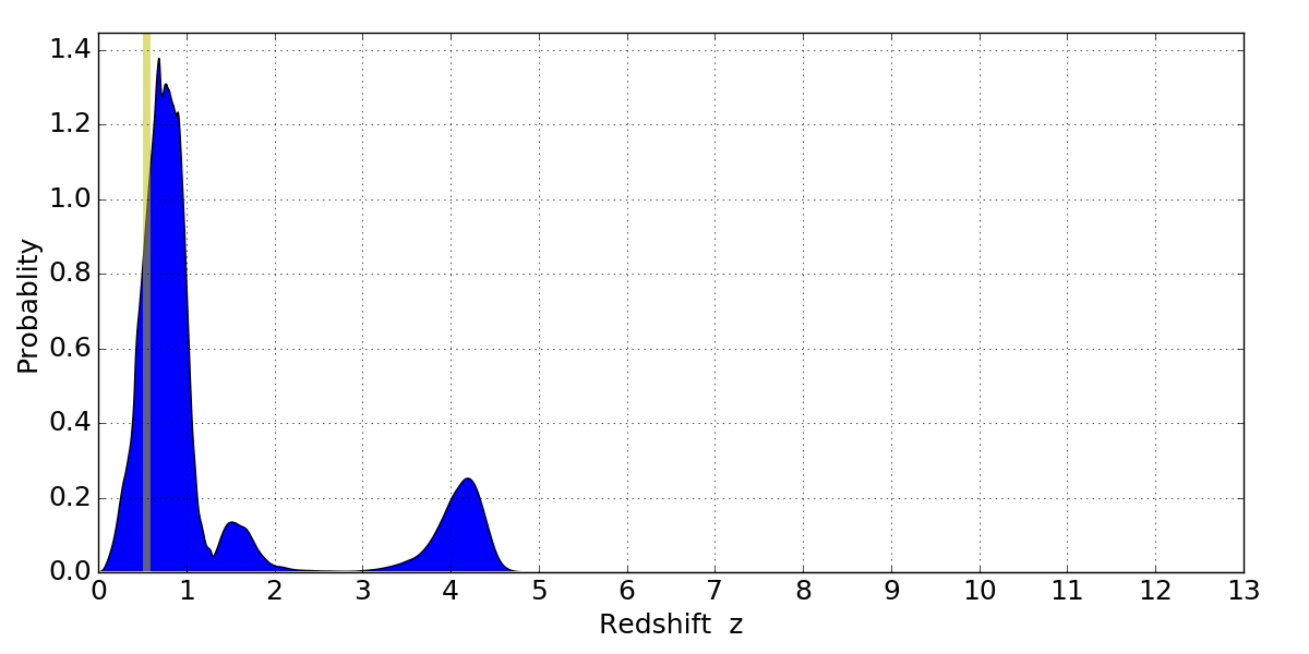 In P(z) plots: Yellow lines mark the cluster redshift z = 0.546,