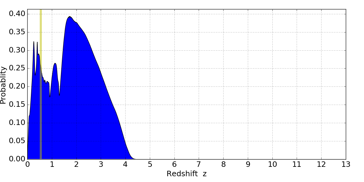 In P(z) plots: Yellow lines mark the cluster redshift z = 0.546,