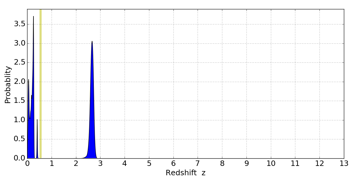 In P(z) plots: Yellow lines mark the cluster redshift z = 0.546,