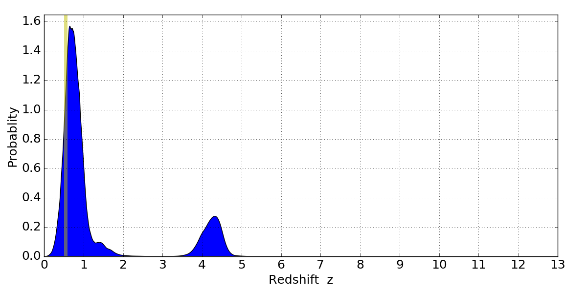 In P(z) plots: Yellow lines mark the cluster redshift z = 0.546,