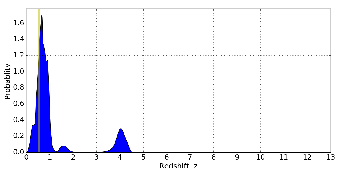 In P(z) plots: Yellow lines mark the cluster redshift z = 0.546,