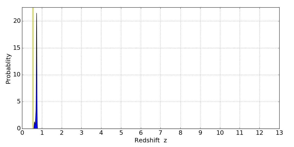 In P(z) plots: Yellow lines mark the cluster redshift z = 0.546,