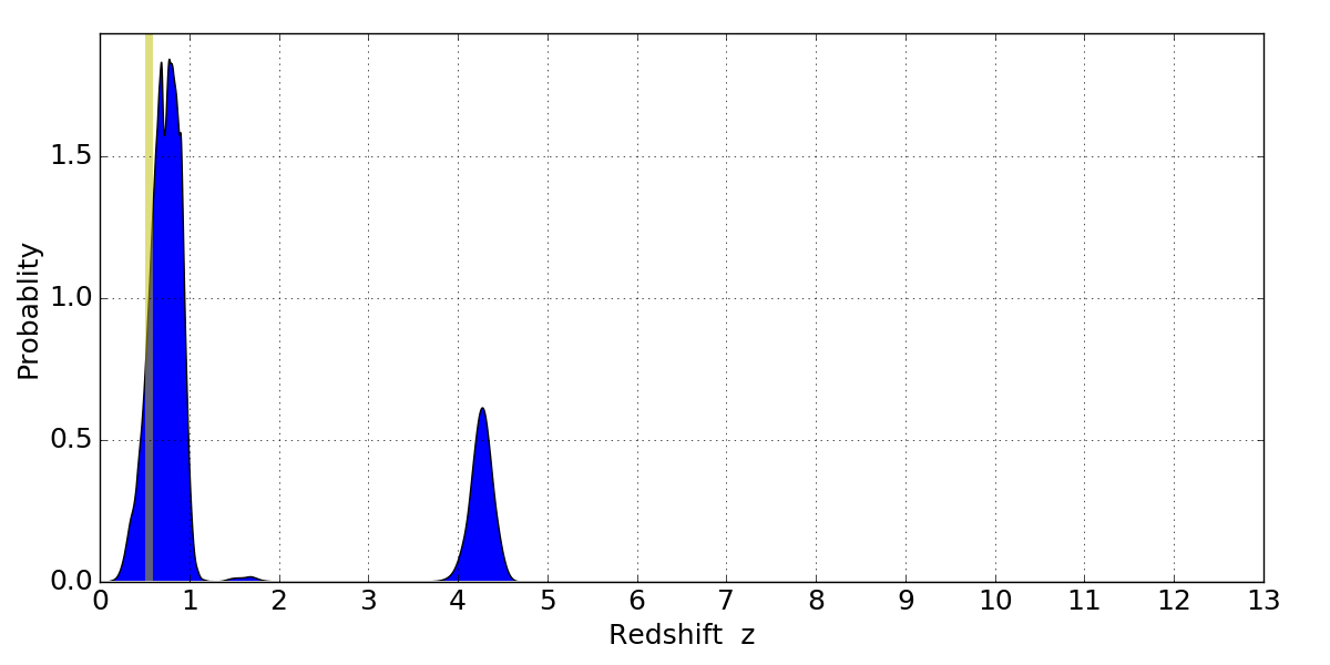 In P(z) plots: Yellow lines mark the cluster redshift z = 0.546,