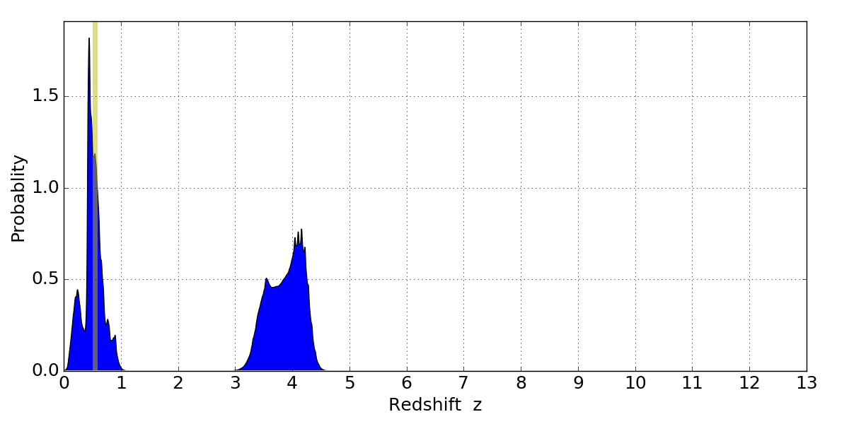 In P(z) plots: Yellow lines mark the cluster redshift z = 0.546,
