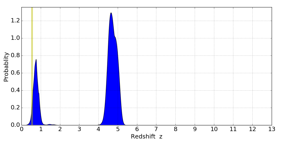 In P(z) plots: Yellow lines mark the cluster redshift z = 0.546,