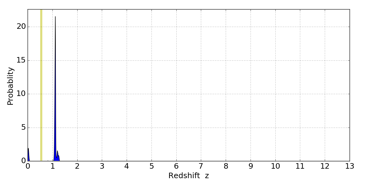 In P(z) plots: Yellow lines mark the cluster redshift z = 0.546,