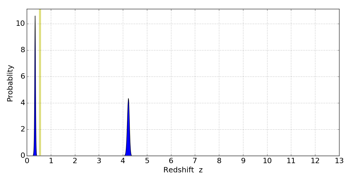 In P(z) plots: Yellow lines mark the cluster redshift z = 0.546,